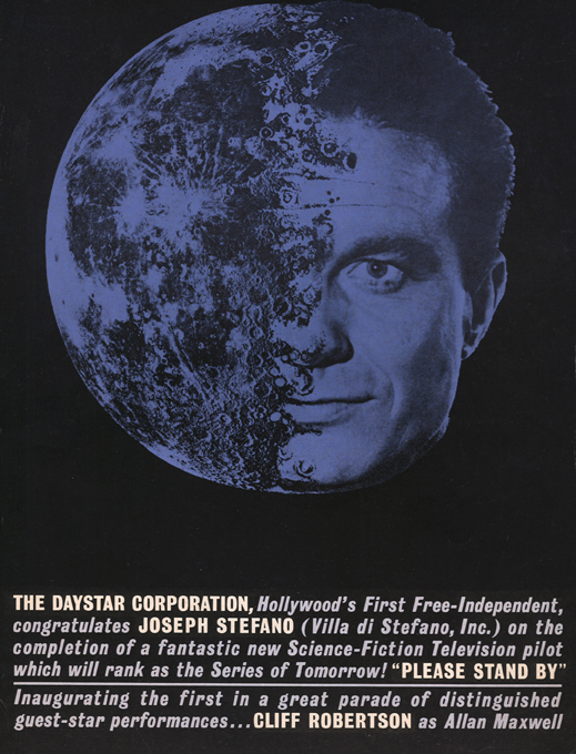 Joe Stefano (L) and Leslie Stevens in a photo by Gene Trindl for the Richard Gehman’s TV Guide article, “They Deal in Ideas … and Outer Space” (21 March 1964). Note crate from KTTV, formerly Metromedia Television’s Channel 11 in Los Angeles, the location of the soundstages used for most of Season One’s interior shots.